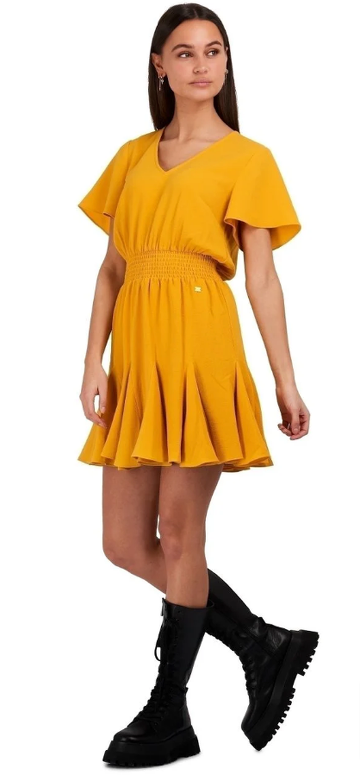 Als je in een vrolijke bui bent, dan wil je dat het liefst aan de hele wereld laten zien. Dat kan met deze okergele flowy jurk! De losse fit met elastische band laat de jurk mooi om het lichaam vallen en benadrukt de taille. Ook de mouwen vallen sierlijk en speels om de armen heen. Een mooie v-hals laat de nek open voor eventuele accessoires. In deze gele jurk straal je de hele dag door en ben je klaar voor een mooie zomer!