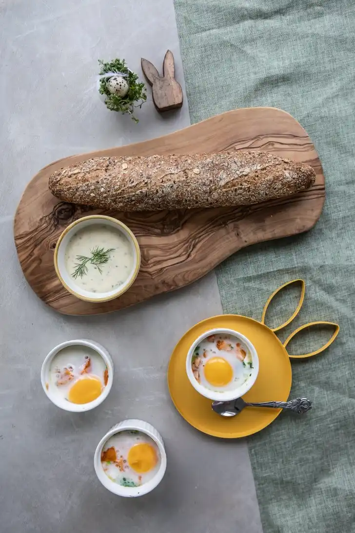 - Zet de schaaltjes in de braadslee. Vul de braadslee tot twee derde van de rand van de schaaltjes met heet water en zet op het rooster van de oven. Bak de oeufs en cocotte circa 12 minuten in het midden van de oven tot het eiwit gestold is en het eigeel nog zacht is.