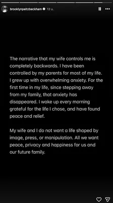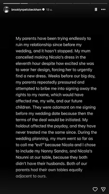 Lange tijd konden we alleen maar speculeren over wat de reden is van de ruzie tussen de familie Beckham en hun zoon. In een reeks Instagram Stories schept Brooklyn echter duidelijkheid en deelt hij keiharde beschuldigingen over zijn ouders David en Victoria Beckham. "Ik ben jaren stil geweest en heb geprobeerd stil te blijven. Helaas blijven mijn ouders en hun team naar de pers gaan, waardoor ik geen andere keuze heb dan voor mezelf te spreken en de waarheid te vertellen over sommige leugens die zijn gepubliceerd", begint hij zijn bericht.