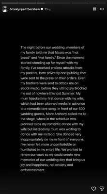 Ondanks dat Nicola respectloos zou zijn behandeld, reisden Brooklyn en Nicola in maart 2025 toch naar Londen voor het grote verjaardagsfeest van David Beckham. "We wilden quality time inplannen, maar dat werd geweigerd", geeft hij aan. "Hij wees al onze pogingen af, tenzij het plaatsvond op zijn grote verjaardagsfeest, met honderd gasten en camera's op elke hoek. Toen hij me eindelijk wilde zien, was dat onder de voorwaarde dat Nicola niet was uitgenodigd. Dat was een klap in mijn gezicht."
