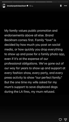 "Mijn familie hecht meer waarde aan publieke promotie en samenwerkingen dan aan wat dan ook. Het merk Beckham komt op de eerste plaats", vervolgt hij. "We hebben jarenlang ons uiterste best gedaan om bij elke modeshow, elk feest en elke persbijeenkomst aanwezig te zijn en 'ons perfecte gezin' te laten zien. Maar toen mijn vrouw een keer mijn moeder om hulp vroeg om honden te redden die dakloos waren geraakt tijdens de bosbranden in Los Angeles, weigerde mijn moeder."