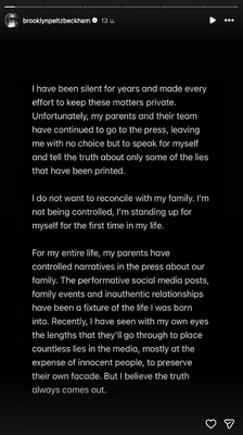 Brooklyn geeft aan dat hij niet zit te wachten op een verzoening met zijn familie en niet langer wil dat zij zijn leven beheersen. "Ik sta voor het eerst in mijn leven voor mezelf op", geeft hij aan. "Mijn hele leven lang hebben mijn ouders de berichtgeving in de pers over ons gezin in de hand gehad", vervolgt hij. "Recentelijk heb ik met eigen ogen gezien hoe ver ze gaan om tig leugens in de media te plaatsen. Meestal ten koste van onschuldige mensen, om hun eigen façade op te houden."