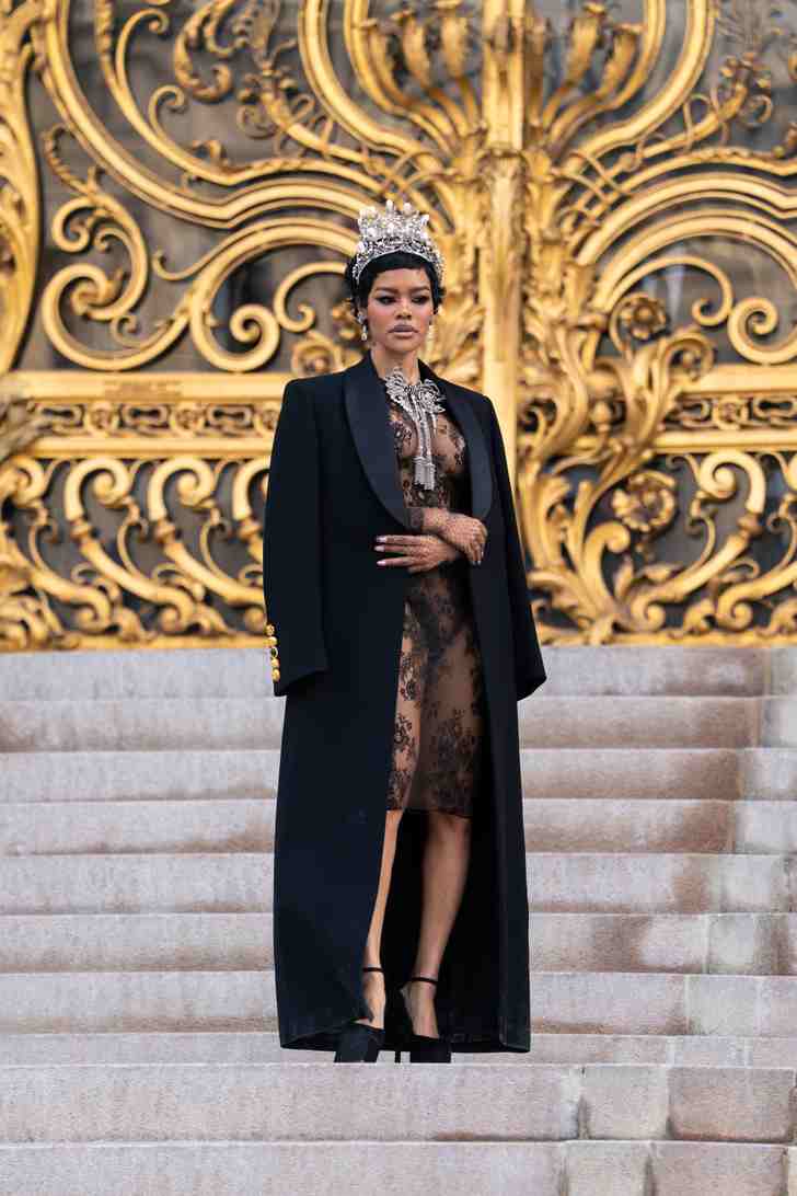 Alle ogen zijn natuurlijk gericht op de catwalk, maar ook de front row-looks stellen niet teleur deze week. De grote favoriet op de redactie? Zonder twijfel Teyana Taylor. "Als ik een euro kreeg voor elke keer dat ik deze week de namen ‘Teyana Taylor’ of ‘Schiaparelli’ had genoemd, dan was ik nu steenrijk", verklapt Sandy. "Deze look doet helemaal recht aan Teyana’s status als fashion royalty en is tegelijkertijd een cheeky knipoog naar de juwelendiefstal uit het Louvre." Beau Monde's hoofdredacteur Sandra is óók fan. "Ik houd van theatrale mode. Niet voor mezelf, maar wel om naar te kijken. Het beste modehuis daarvoor is op dit moment Schiaparelli. De modellen op de catwalk waren gorgeous als altijd, maar wie er voor mij uitsprongen waren de 'bezoekers', waaronder Teyana Taylor. Teyana was de blote bling-versie van Maleficent."