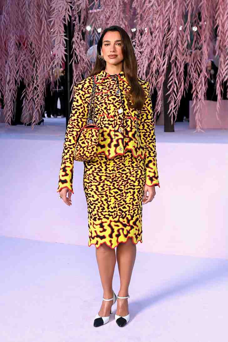 Nog zo'n front row-winnaar: Dua Lipa bij Chanel. "Dua Lipa verscheen in deze opvallende matching set (inclusief bijpassende tas) bij de show van Chanel. De kleuren staan haar fantastisch en de edgy randen maken het geheel net iets minder degelijk", zegt Sanne over de look. "Een paar matching hakken in dezelfde print hadden het helemaal afgemaakt, maar dat mag de pret niet drukken."