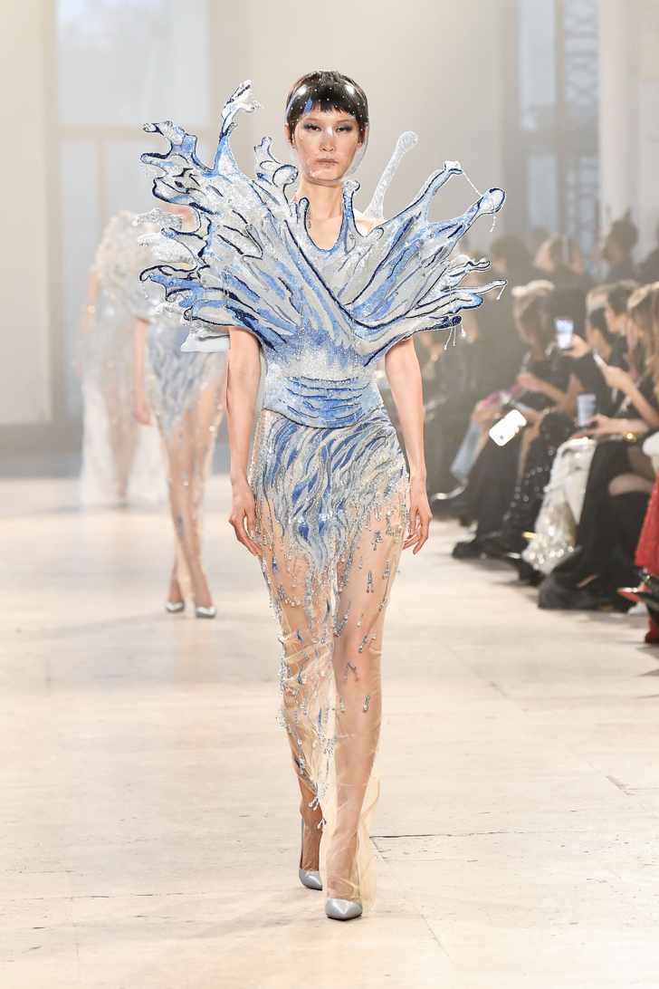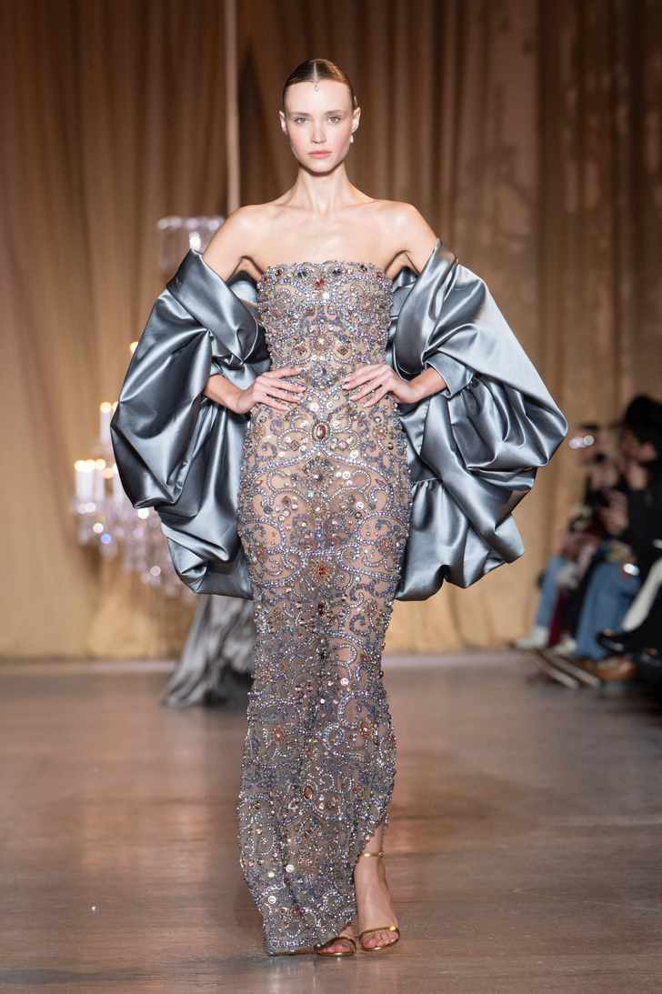 "De show van Zuhair Murad was er weer eentje om bij weg te dromen", zegt Grazia's online redacteur Sanne. "Elke jurk op de runway is oogverblindend mooi, dus kiezen is eigenlijk onmogelijk. Toch springt deze ijsblauwe creatie eruit voor mij. Het contrast van de lange see-through jurk die bedekt is met de mooiste steentjes en de dramatische satijnen mouwen werkt heel goed."