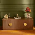 De diepe, warme walnootlook geeft direct een gevoel van luxe, terwijl de deurtjes met een verticaal ribbelpatroon zorgen voor een subtiele, decoratieve textuur. De minimalistische goudkleurige pootjes en handgrepen maken de retro-chique uitstraling compleet. Het is een ontwerp dat zowel warm en uitnodigend als strak en modern aanvoelt.